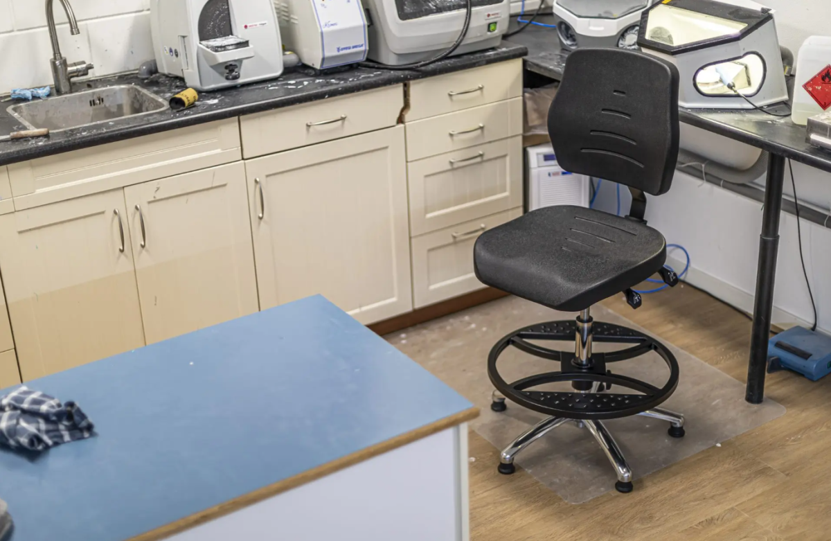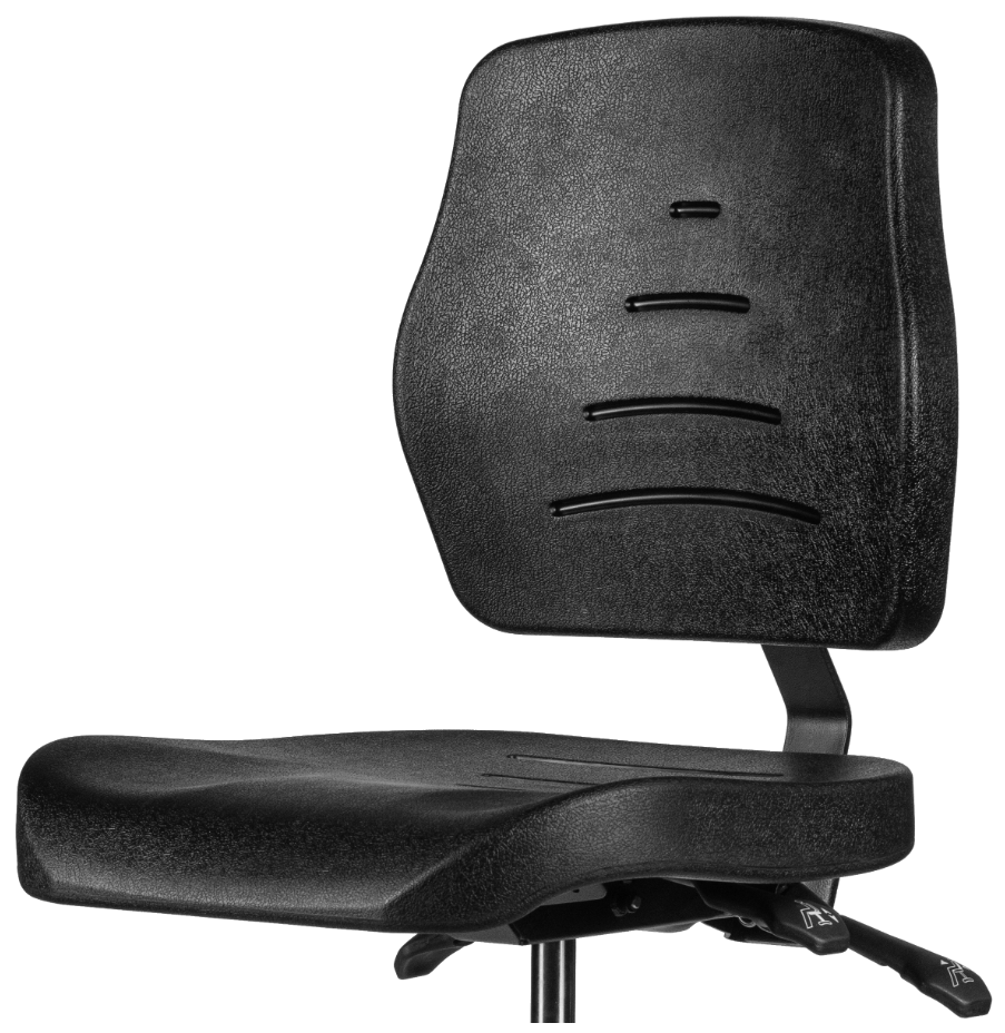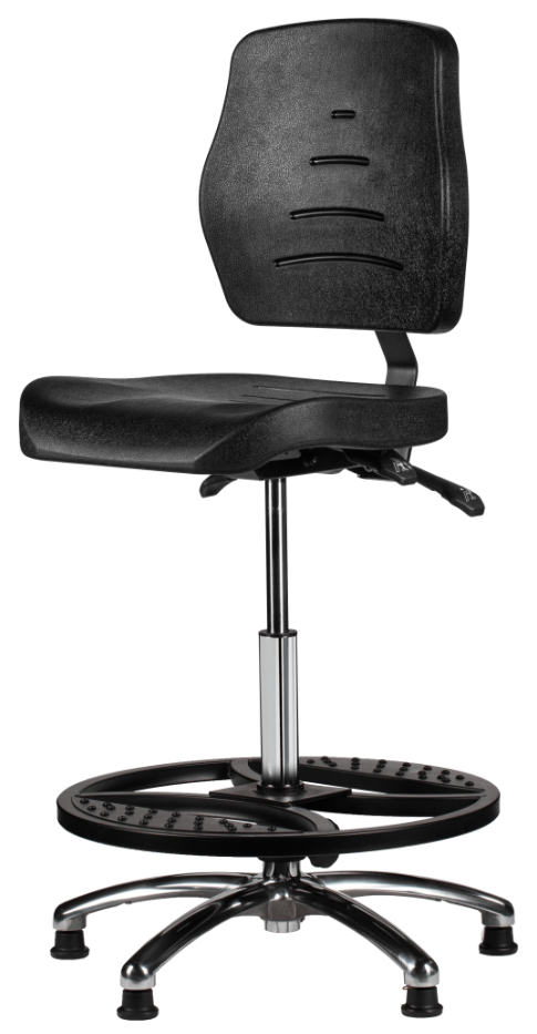 Polyurethaan hoge werkstoel met een thermisch gevormde zitting en rugleuning. Onverslijtbaar en bestand tegen allerlei scheikundige stoffen.